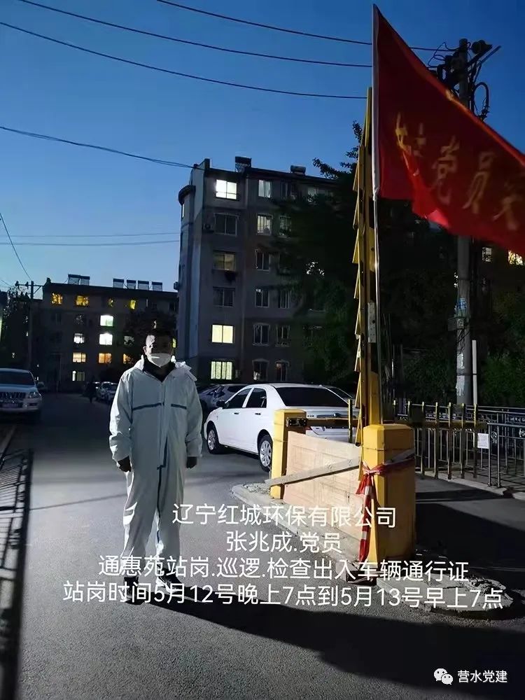 遼寧洪城環(huán)保有限公司黨支部張兆成負(fù)責(zé)通惠苑南門夜間站崗執(zhí)勤,每天工作10多個(gè)小時(shí)。5月14號(hào)早上,他站崗執(zhí)勤結(jié)束剛回到家中,便接到社區(qū)電話,需要挨家挨戶給居民送核酸檢測(cè)盒,他顧不上休息,立即穿上防護(hù)服沖進(jìn)一線,從每一個(gè)單元一樓開始敲門一直敲到6樓,發(fā)放結(jié)束后他已是滿身汗水,腰酸腿疼,坐在地下休息半天才起來(lái)。其實(shí)他家中有兩個(gè)年幼的孩子,尤其是老二還不滿兩周歲,正需要人照看,他把兩個(gè)孩子都留給妻子一人照顧,舍小家為大家,用大愛(ài)和奉獻(xiàn),譜寫了一曲動(dòng)人的抗疫贊歌。